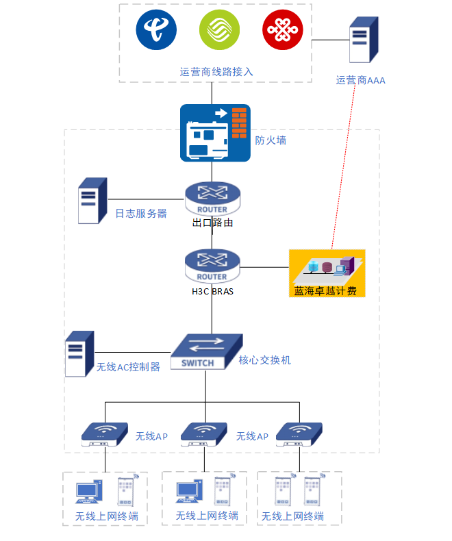 經過多方調研與方案比對,寶雞機電學院最終選擇與藍海卓越合作。藍海卓越憑借在教育行業(yè)多年的技術積累和豐富的項目落地經驗,針對學院需求定制了 “計費系統(tǒng) + H3C BRAS 對接 + 電信 AAA 二次認證” 的一體化解決方案,精準破解了學院網絡管理的核心痛點。